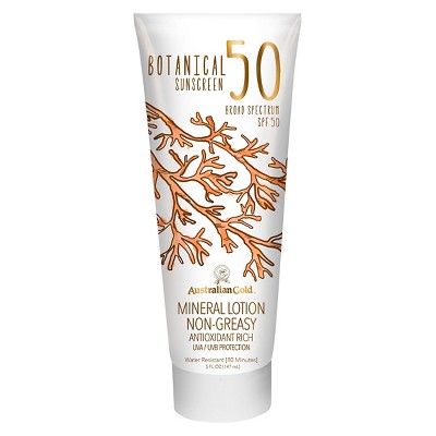 La loción mineral Botanical SPF 50 de Australian Gold® es más que una poderosa protección solar: es cuidado suave para la piel. Esta loción de protección solar no química ofrece una sensación refrescantemente y limpia. Especialmente diseñada para pieles sensibles, esta loción no obstruirá los poros y no tiene fragancia. Rico en vitaminas y antioxidantes de ingredientes botánicos nativos de Australia, le permite disfrutar del sol, protegido de los rayos UVA y UVB y resistente al agua durante hasta 80 minutos.