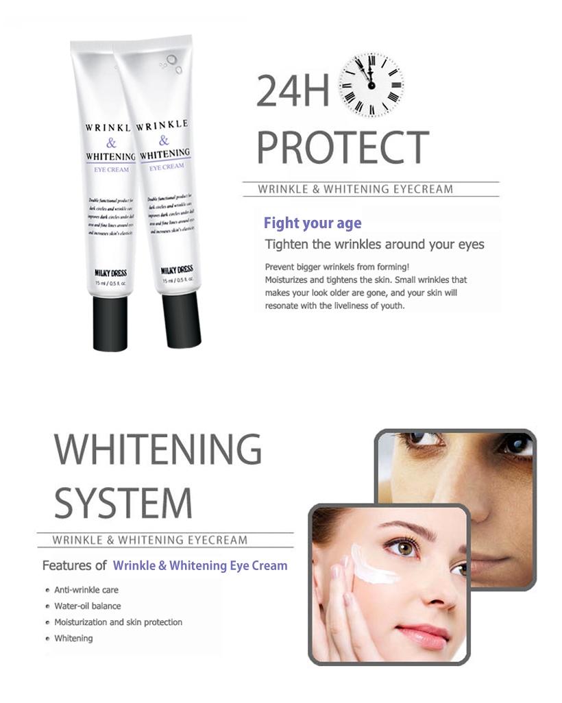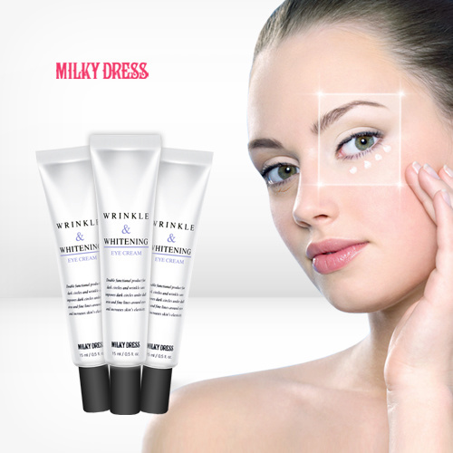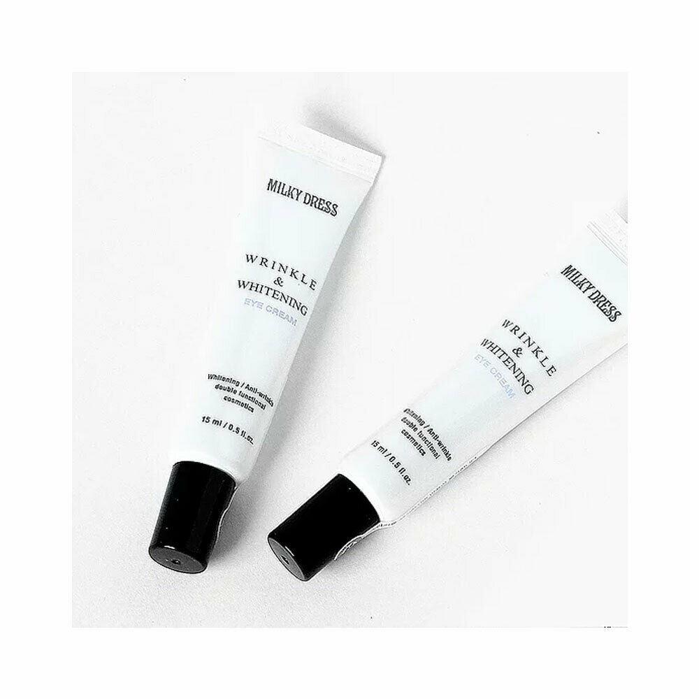MILKY DRESS Wrinkle & Whitening Eye Cream es una refrescante crema para ojos tipo gel que mejora la oscuridad y el brillo debajo de los ojos y las arrugas, al mismo tiempo que mantiene los ojos hidratados y vitalizados. Además, también cuida intensamente nutriendo e hidratando los ojos débiles y secando fácilmente durante 24 horas para unos ojos más brillantes y radiantes.