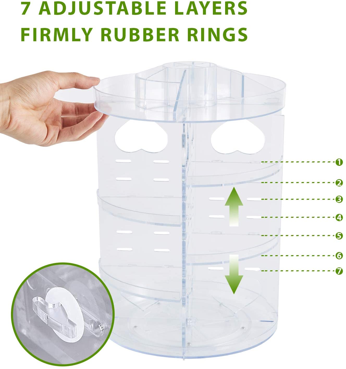 - Construcción resistente, extremadamente duradero: este organizador de maquillaje está hecho de acrílico sólido. Está apoyado por una base estable y un diseño antideslizante. Los anillos de goma mantienen las capas firmemente en su lugar.